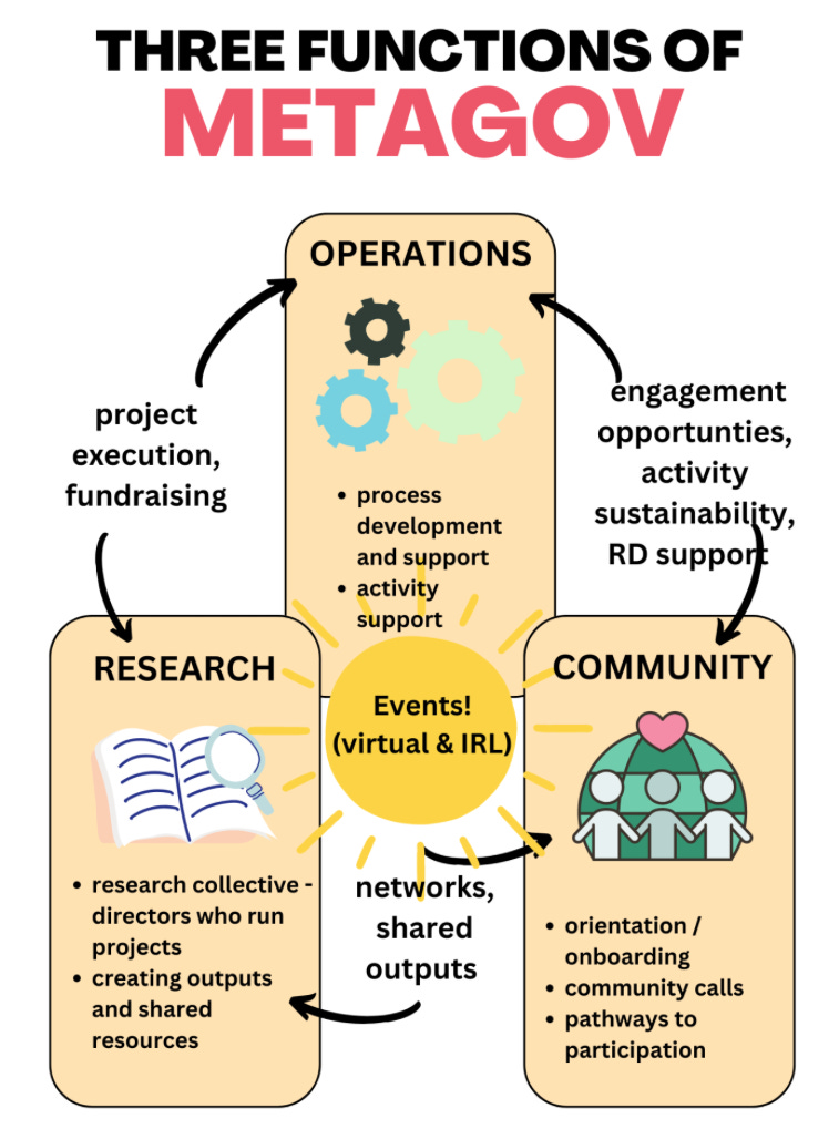 At the same time, the community is filled with researchers and practitioners all around the world who have their own projects, and / or who are looking to learn from our research outputs. So, simultaneously, we are also trying to figure out how Metagov’s research and projects could be made more useful for the greater community.